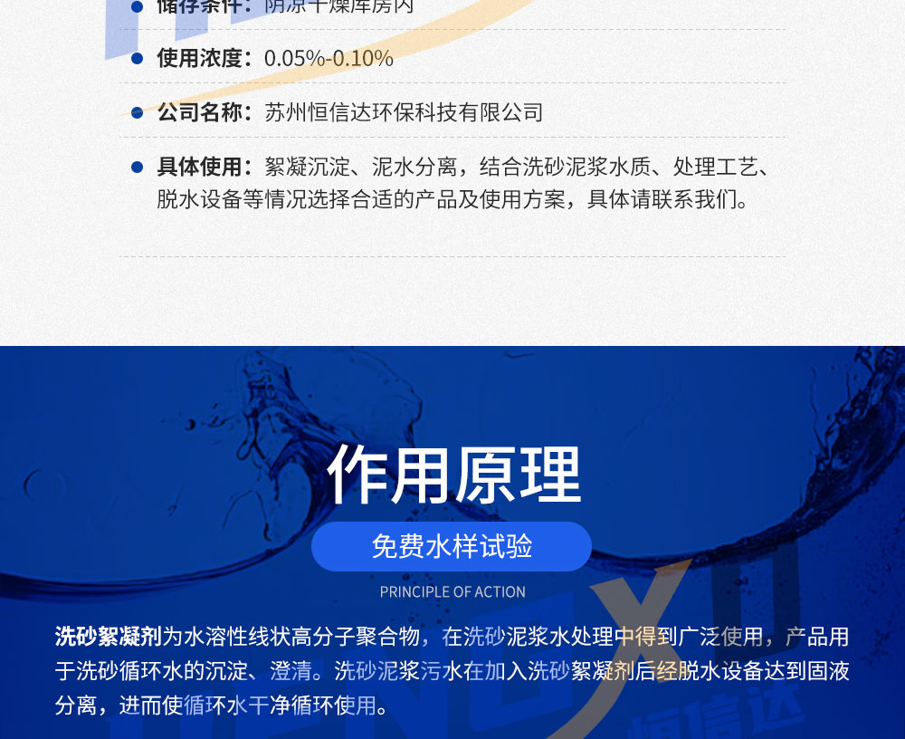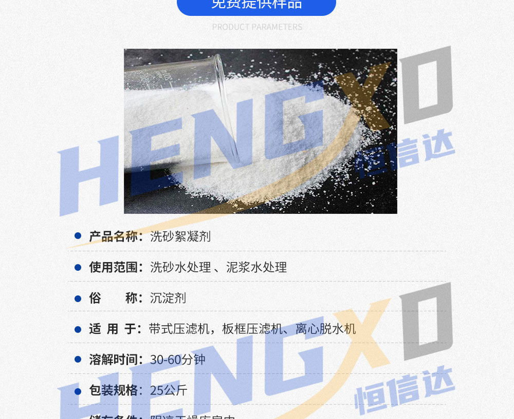 產(chǎn)品名稱:洗砂絮凝劑,使用范圍:洗砂水處理 、泥漿水處理,俗稱:沉淀劑,適用于:帶式壓濾機(jī),板框壓濾機(jī)、離心脫水機(jī),溶解時間:30-60分鐘,包裝規(guī)格:25公斤,儲存條件:陰涼干燥庫房內(nèi),使用濃度:0.05%-0.10%,具體使用:絮凝沉淀、泥水分離,結(jié)合洗砂泥漿水質(zhì)、處理工藝、脫水設(shè)備等情況選擇合適的產(chǎn)品及使用方案,具體請聯(lián)系我們。