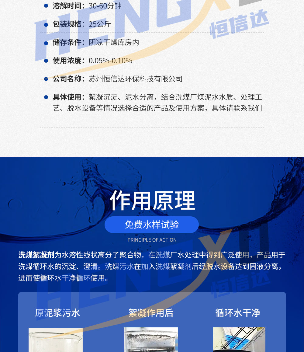 產(chǎn)品名稱:洗煤絮凝劑,使用范圍:洗煤污水處理,溶解時(shí)間:30-60分鐘,包裝規(guī)格:25公斤,儲存條件:陰涼干燥庫房內(nèi),使用濃度:0.05%-0.10%,具體使用:絮凝沉淀、泥水分離,結(jié)合洗煤廠煤泥水水質(zhì)、處理工藝、脫水設(shè)備等情況選擇合適的產(chǎn)品及使用方案,具體請聯(lián)系我們。