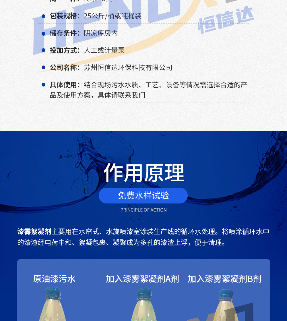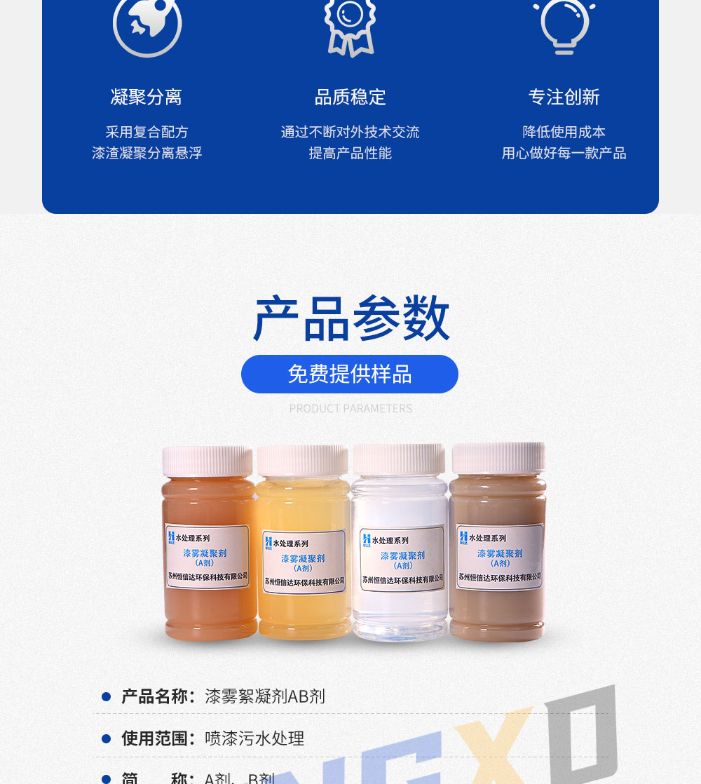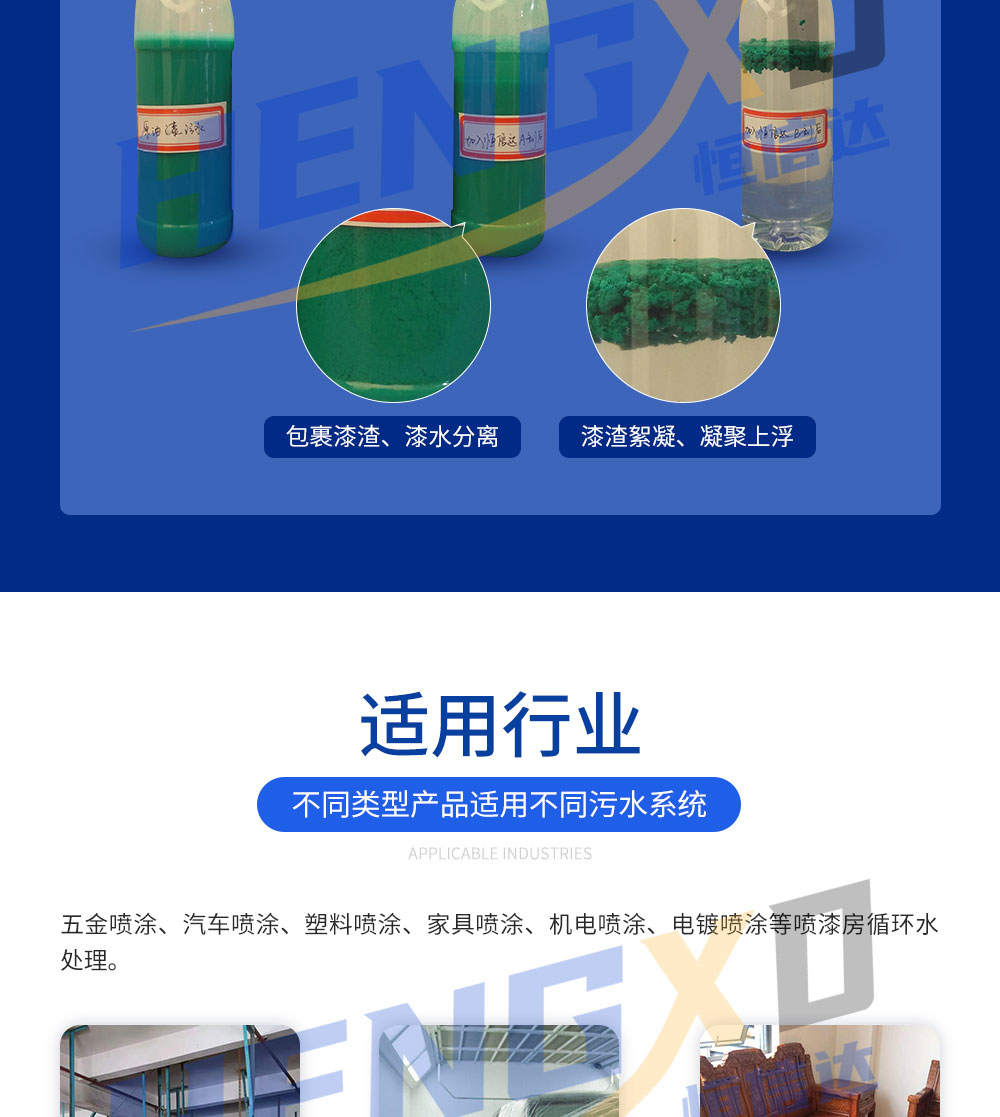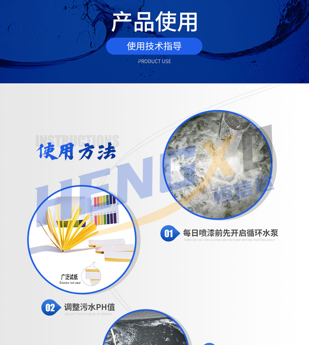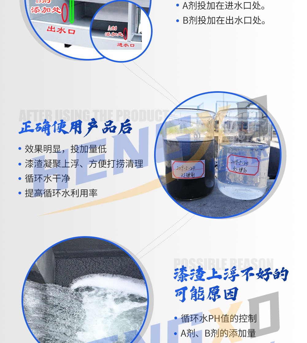 漆霧絮凝劑AB劑主要用在水簾式、水旋噴漆室涂裝生產(chǎn)線的循環(huán)水處理。漆霧絮凝劑將噴涂循環(huán)水中的漆渣經(jīng)電荷中和、絮凝包裹、凝聚成為多孔的漆渣上浮,便于清理。